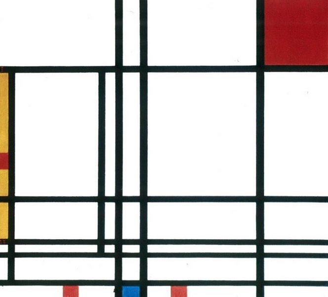 Kijk eerst goed naar dit kunstwerk van Piet Mondriaan. Bekijk ook de twee foto's die eronder staan; de foto's van het kunstwerk van dichtbij: